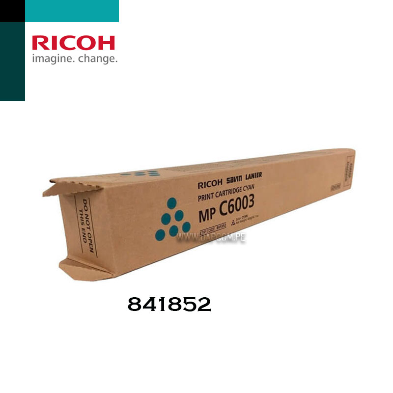 Los Cartuchos de Tóner Ricoh con sub-código de identidad 841852 viene con un chip inteligente insertado en el cartucho 841852 la cual contabiliza las impresiones de color Cyan que sé realizan, de igual manera el código del tóner se encuentra grabado en el cartucho, en modo de alto relieve el cual es 841852, que vendría a ser su identificador como producto de la casa Ricoh